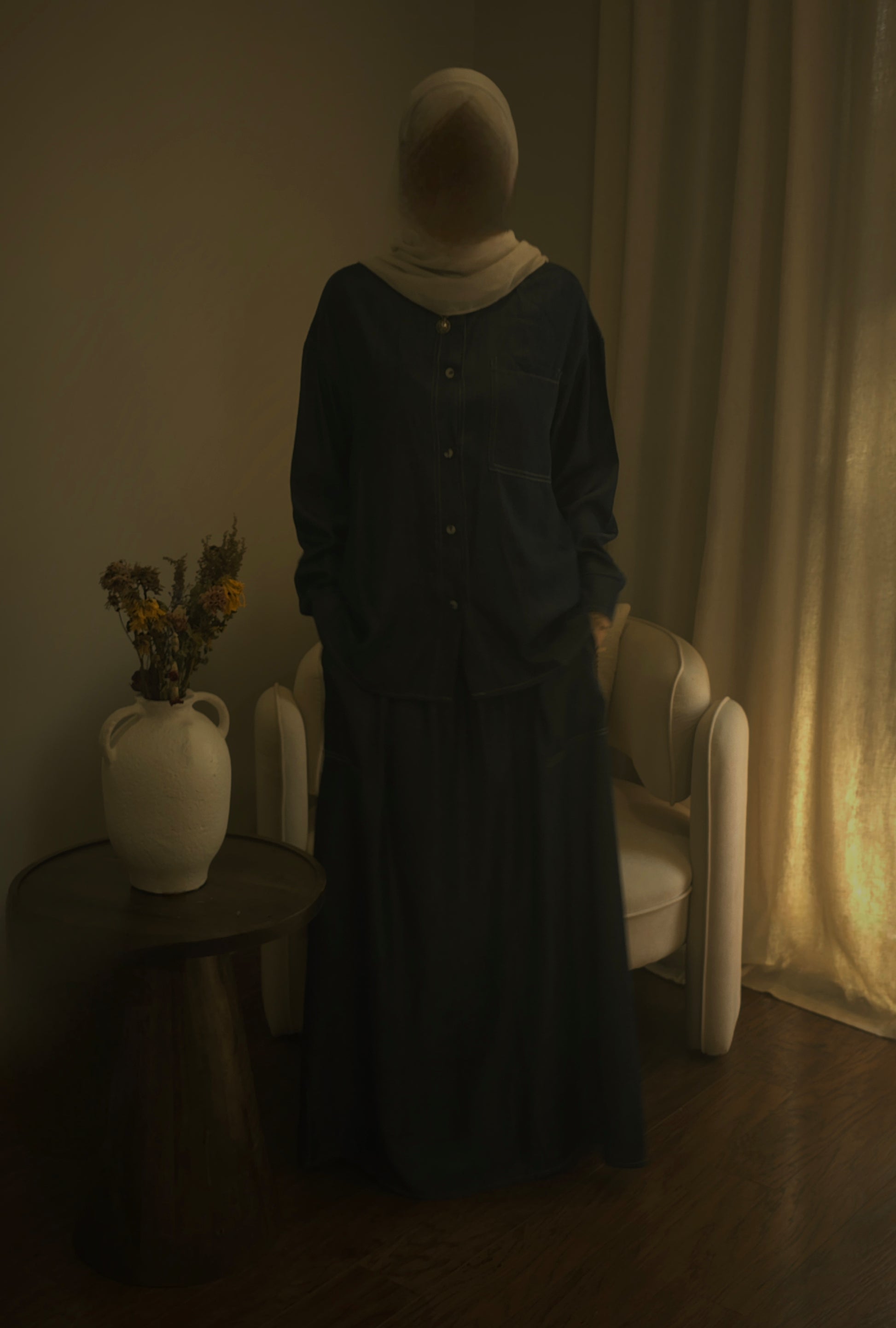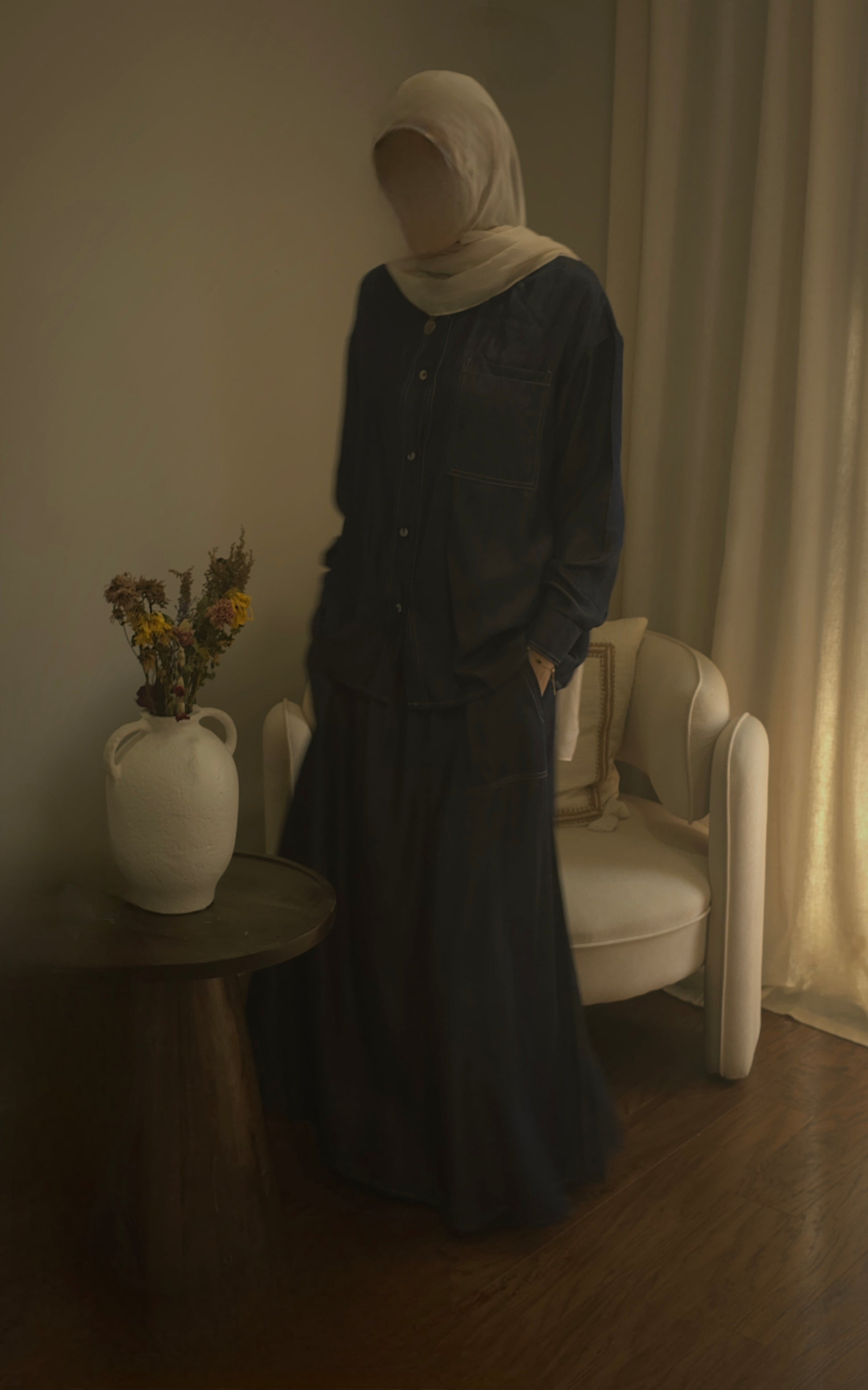 This flowy set gives you the classic jeans vibe with a soft, breathable twist featuring a relaxed shirt and a maxi skirt with pockets for everyday ease. it may look like denim but we assure you it feels like a blessing.